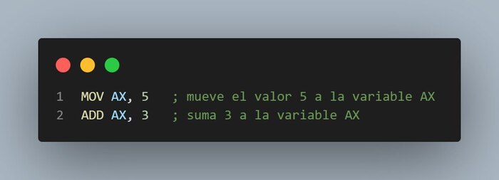 Este código en ensamblador mueve (MOV) el valor 5 en el registro AX y luego le suma (ADD) 3 al mismo registro.